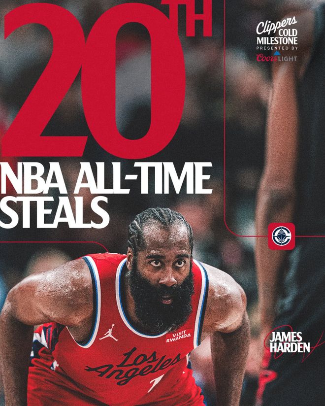 北京时间1月23日,NBA常规赛,快船以112-104击败湖人。这场比赛是哈登的里程碑之战,他的历史抢断数1766+超越伊戈达拉升至第20位。这场比赛哈登的手感依旧不佳21投6中,但他送出10个助攻引来全队7人得分上双,他在关键时刻的选择也是球队制胜的关键。