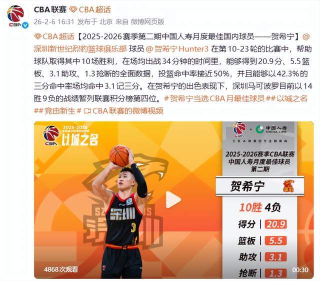 北京时间2月6日,CBA官方公布2025-26赛季第二期月度奖项,深圳男篮一战封神——山东济南小伙贺希宁当选月度最佳国内球员,史密斯荣膺月度最佳国际球员。这不是偶然,而是一场关于效率、统治力与团队崛起的完美合奏。